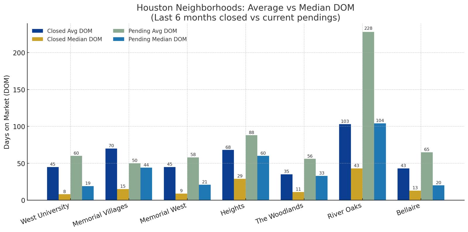As always, River Oaks is its own case: The average DOM is 103 days, but the median is 43. Pending sales are heavily skewed at 228 average and 104 median.